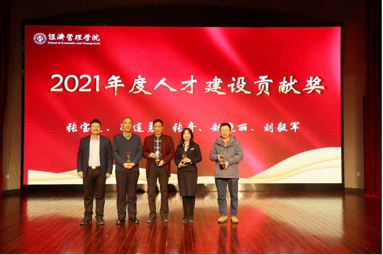 朱义清宣读了关于表彰2021年度经济管理学院各项工作突出贡献奖和贡献奖获得者的决定,对在党建、科研、教学、人才、公共服务、学生工作、工会工作等作出突出贡献和在院内教学比赛中获奖的老师进行表彰并颁发了奖杯和证书,激励全院教职工以先进为榜样,积极进取,开拓创新。