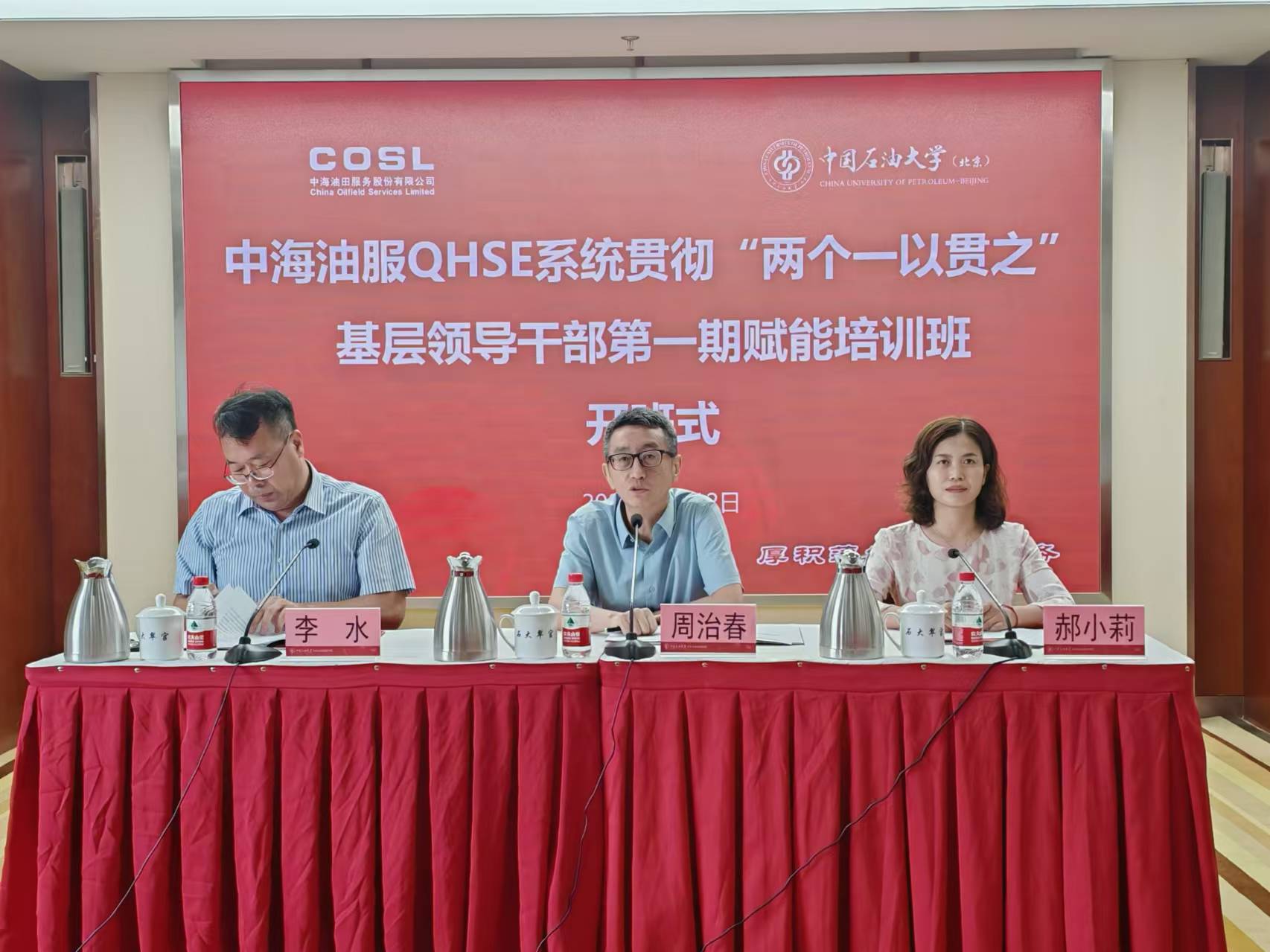2024年8月12日,由我校承办的中海油服QHSE系统贯彻“两个一以贯之”基层领导干部第一期赋能培训班顺利开班。中海油田服务股份有限公司质量安全部总经理周治春、中国石油大学(北京)网络与继续教育学院副院长李水出席开班式并讲话,网络与继续教育学院高层次发展中心主任郝小莉主持开班式。