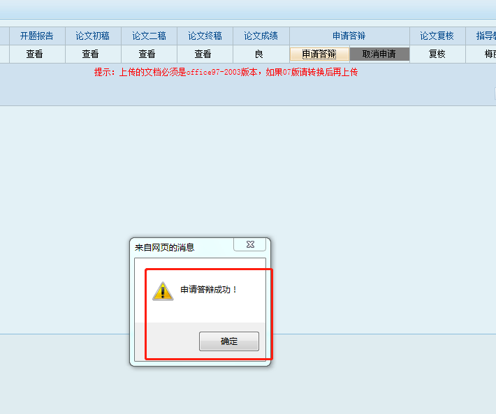 拟参加答辩同学请于10月8日17:00前进入学生工作室—毕业论文—论文操作模块,点击申请答辩,申请成功后会出现申请答辩成功的对话框,见下图。在此期间可申请取消答辩,逾期将无法进行申请或取消申请。