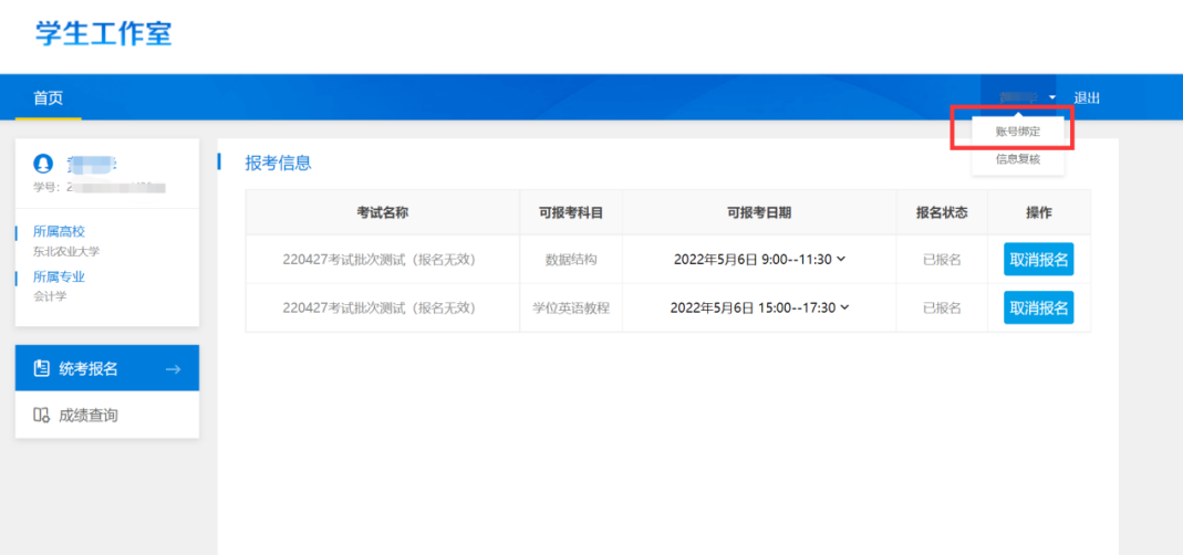 点击学生工作室右上角“账号绑定”,按照系统提示,进行密码修改操作
