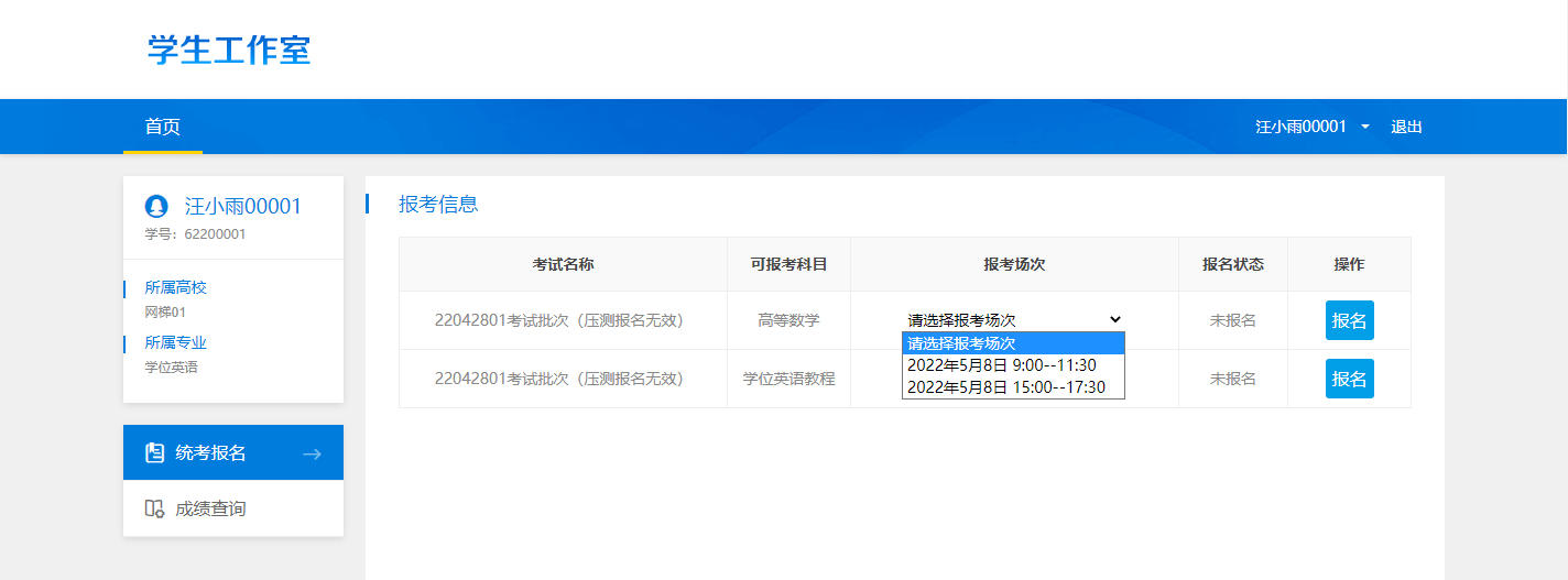 1.报考信息界面显示考生待报考科目,考生可根据自身情况选择适合的考试日期及场次时间,点击“报名”按钮即可进行报名。已报满的场次不再显示可选。