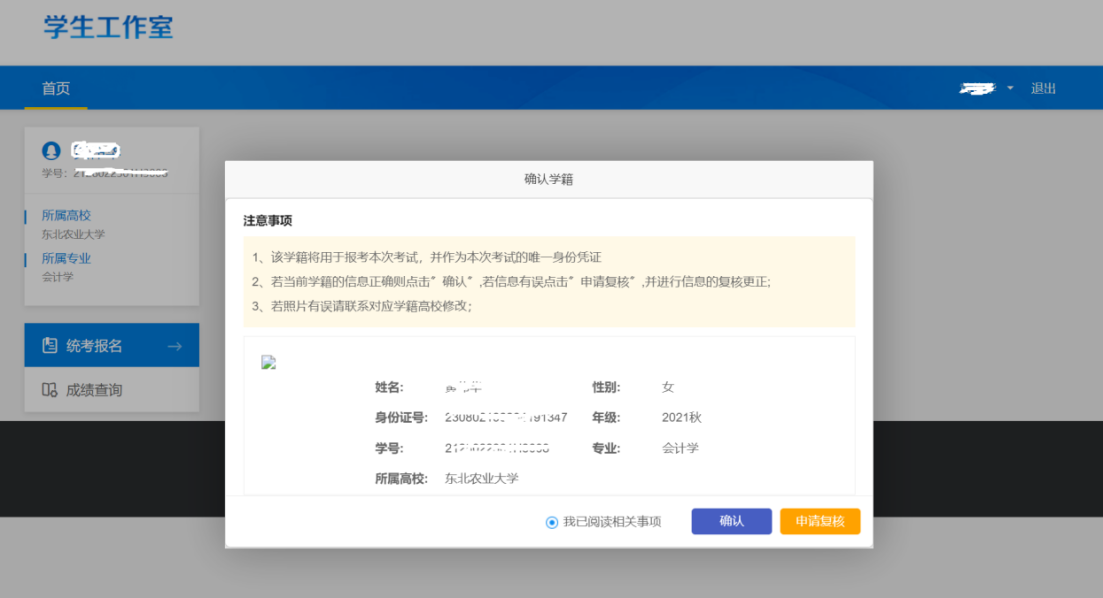 登录完成后,系统会弹出“确认学籍”信息窗口,请考生认真核对姓名、身份证号码、照片等信息,保证个人信息的真实、准确、有效,确认无误后点击“确认”。如信息有误可点击“申请复核”进行信息更正申请。(如考生照片有误,则需联系所在学习中心申请修改。)