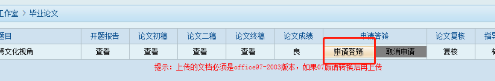 1.所有申请答辩的学生必须通过学生工作室点击“申请答辩”,没有在学生工作室申请答辩的,视为自动放弃答辩资格。