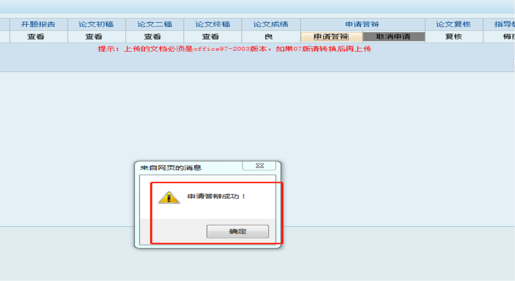 拟参加答辩同学请于3月16日之后进入学生工作室—毕业论文—论文操作模块,点击申请答辩,申请成功后会出现申请答辩成功的对话框,见下图。在此期间可申请取消答辩,逾期将无法进行申请或取消申请。